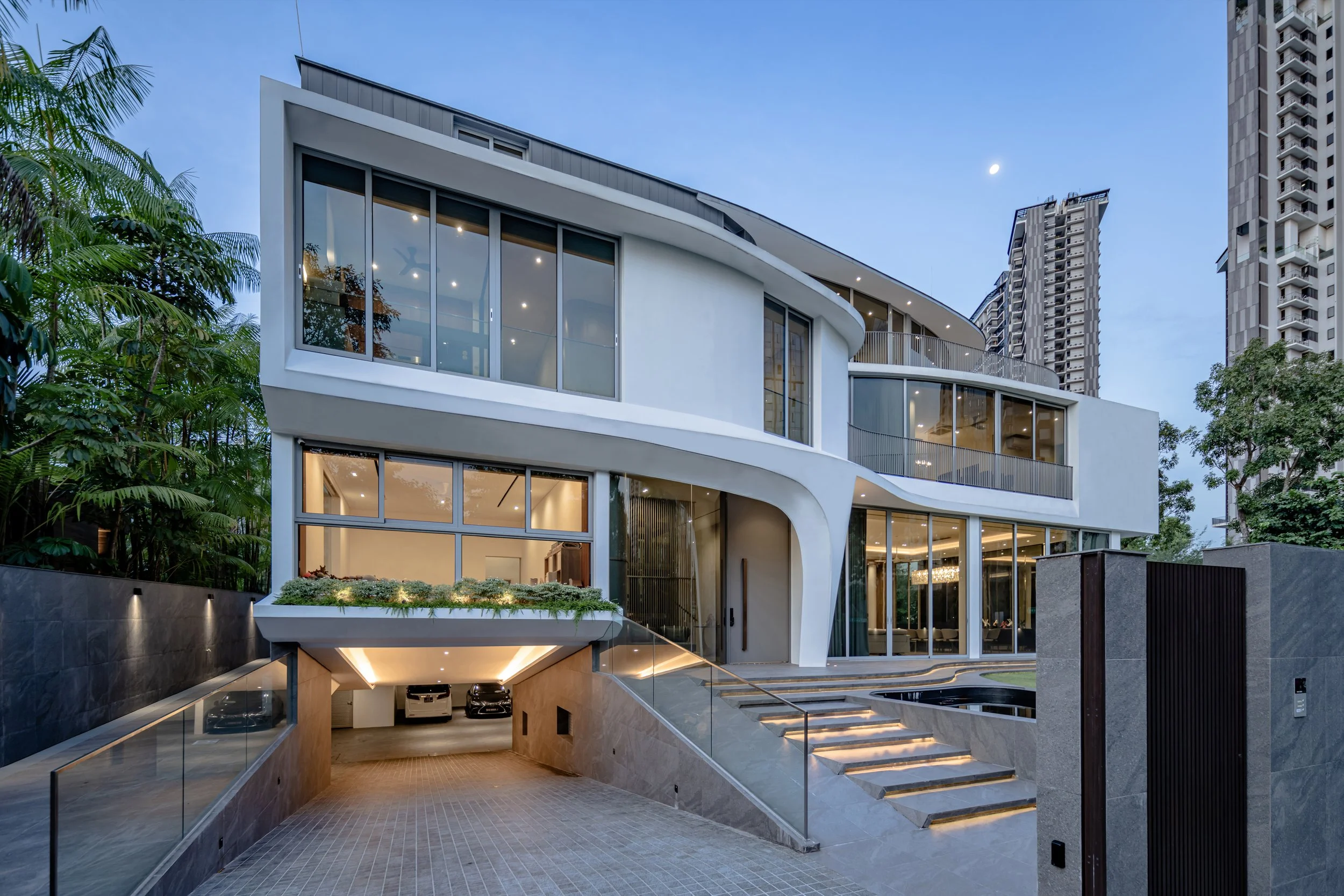 The design is inspired by the beauty of butterfly wings and by petals of a flower. Each wing/petal articulates a zone for the families. Functionally, these forms help carve spaces for balconies and voids for skylights into the basement. Above the attic, a large sweeping roof covers entire house bringing all the spaces conceptually under one roof. These curvaceuos sculpted forms break the scale of the large house, creating soft elegant lines that outline an iconic form for this large bungalow.
