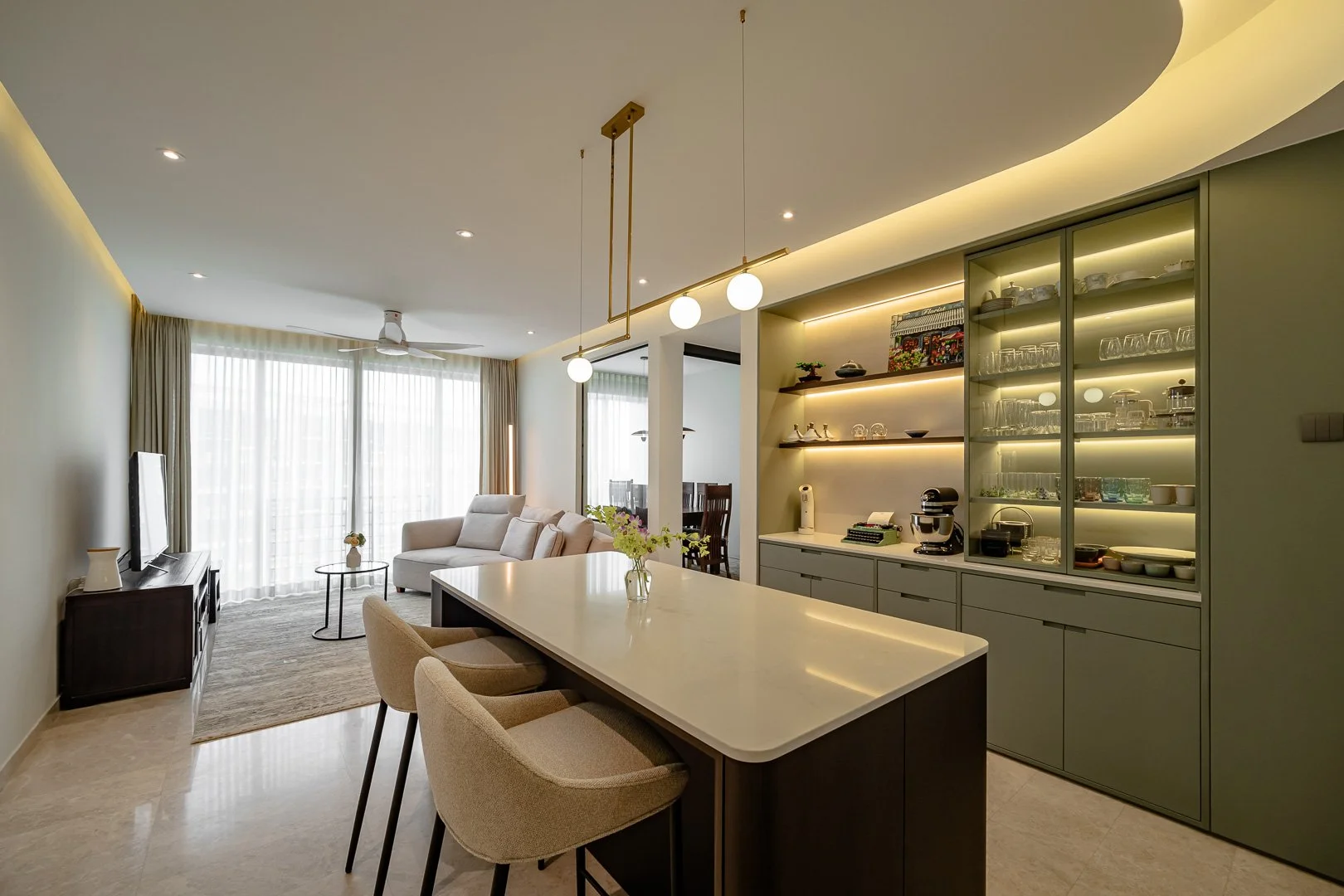 This apartment is designed for a family of three and is based on the idea of being ‘separated yet connected’. This project takes further our ideas of visual connection and practical zoning, as well as creating an environment that encourages interaction within the family, wherever they are in the home. Strategic portals, windows and glass partitions create individual zones such as the dining and wet kitchen areas, allowing these areas to be connected spatially, yet still being practical.